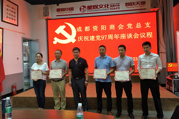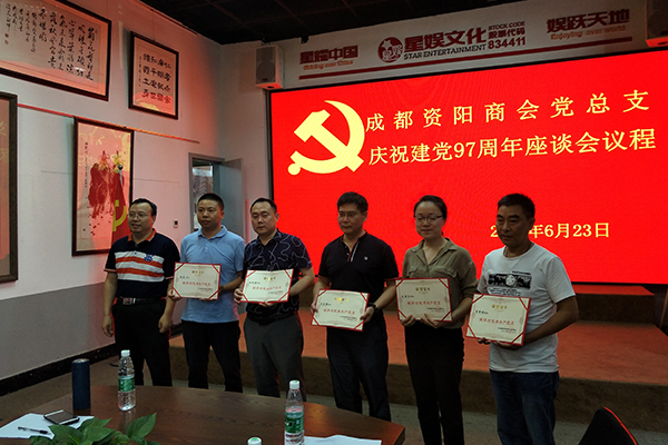 6月23日下午,成都资阳商会党总支在会员企业党支部——星娱文化会议室召开庆祝建党97周年座谈会。党总支一班人、商会党员、部分会长、理事、会员参加座谈会。会议进行了重温入党宣誓,表彰了星娱文化、标杆电气两个党支部,表彰了胡奎、李光耀、杜邦晏等15名优秀共产党员。